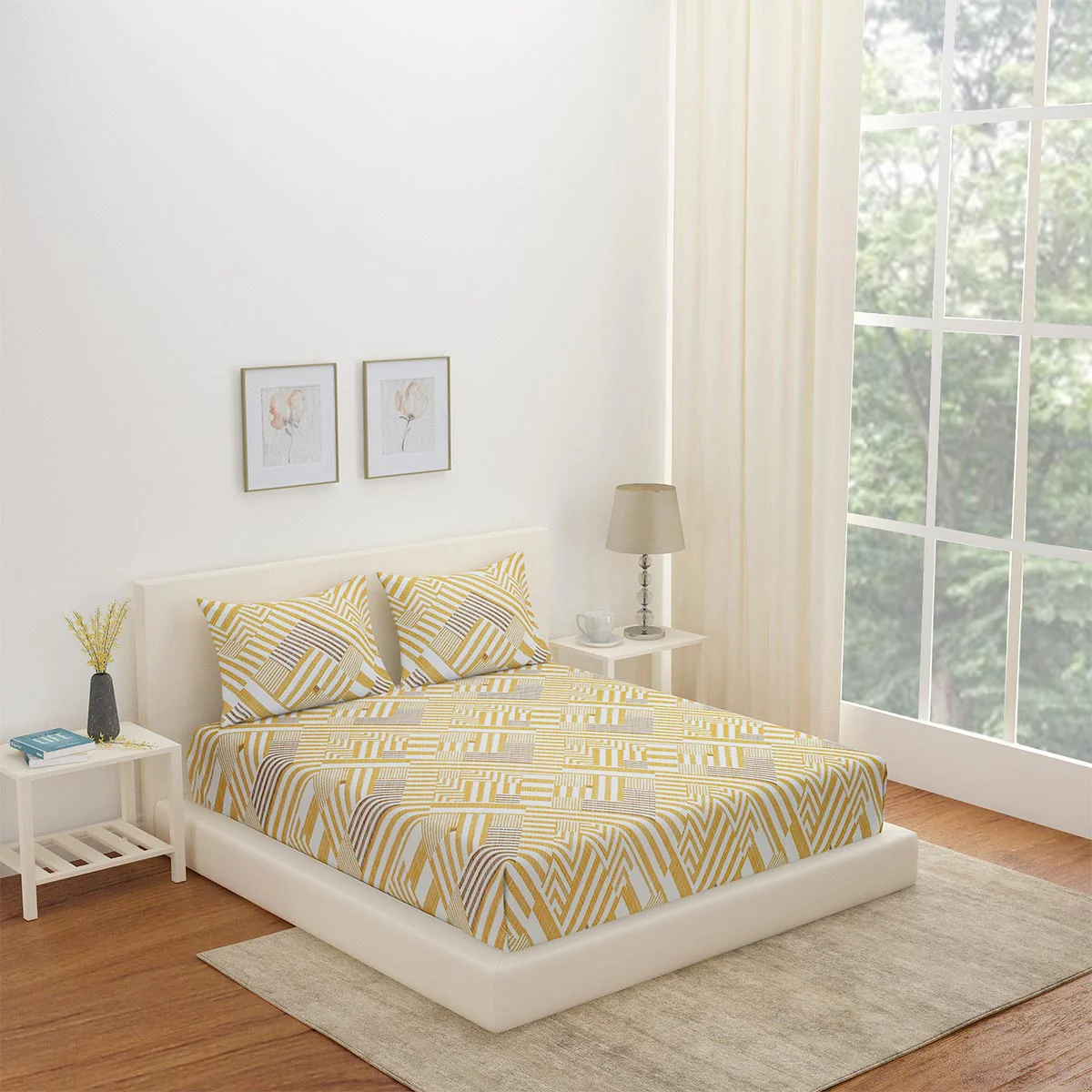 Arias by Lara Dutta Geometric Cotton King Bedsheet With 2 Pillow Covers (Yellow)