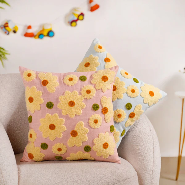 Adorned with delicate white daisies embroidered with green dots that mimic leaves, this cushion cover set is like a breath of fresh air for your space. One features a serene lavender background, while the other showcases a calming blue, each creating a perfect balance of colour and nature.